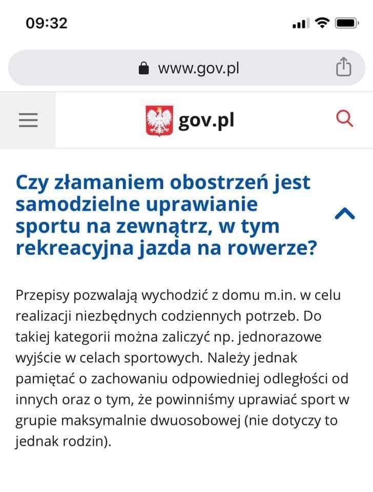 To co pisze na stronach rządowym jest tyle warte co kawałek papieru toaletowego oraz konkretny cel jego użycia. Rzecznik KGP Policji bezczelnie kłamie twierdząc, że nie zna przypadku ukarania kogoś za bieganie, jazdę rowerem, wizytę w myjni. Potem wychodzi przed kamery sam komendant główny policji i plecie, że to nie czas na sport i można to odłożyć albo kupić sobie trenażer. Staje się też ekspertem jak to biegacz czy rowerzysta rozsiewa zarazki na lewo i prawo ale też i przyjmuje ich x razy więcej. Nie dawajcie więcej takich przykładów bo to zwyczajnie nie ma sensu. Te nieudaczniki nie są w stanie i nigdy nie będą ustalić jednej wspólnej wersji.